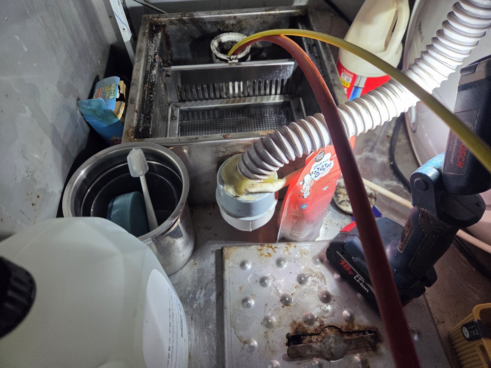 먼저 현장 담당자와 최근 사용 환경을 상세히 확인했습니다. 최근 매출 증가로 조리량이 급격히 늘었고 설거지 회전율이 높아지면서 배수 속도가 점점 느려졌다고 합니다. 초반에는 물이 천천히 빠지는 정도였지만 어느 순간부터는 여러 공간에서 동시에 정체 현상이 발생하며 내부 사용 자체가 어려워진 상태였습니다. 특히 기름 사용이 많은 메뉴 특성상 내부 오염 축적 가능성이 높다고 판단했습니다.