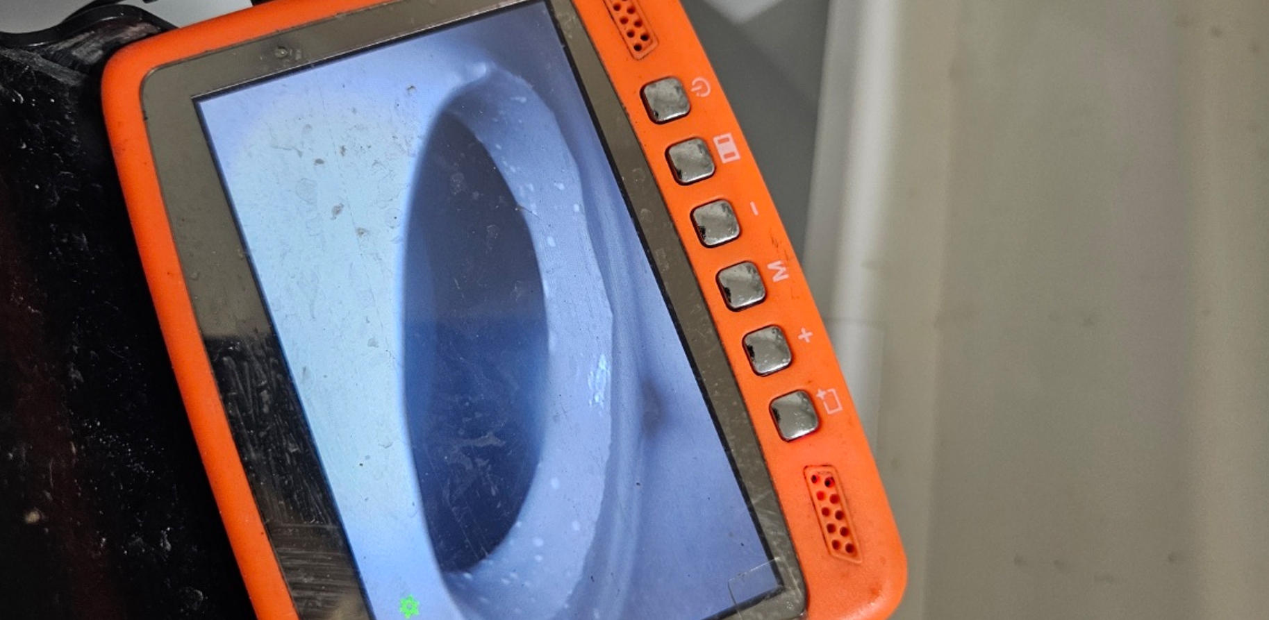 정확한 상태 파악을 위해 점검 장비를 투입해 내부를 확인했습니다. 굽은 구간을 중심으로 섬유질이 여러 겹으로 뭉쳐 있었고, 그 주변에 기존 잔여물까지 함께 붙어 통로 폭을 상당 부분 좁히고 있는 모습이 확인됐습니다. 물에 닿으면 분해된다고 알려진 재질이었지만, 실제 내부에서는 수분을 머금으며 부피가 커진 상태였습니다. 위치와 고정 상태를 파악한 뒤 단계적인 작업이 필요하다고 판단했습니다.