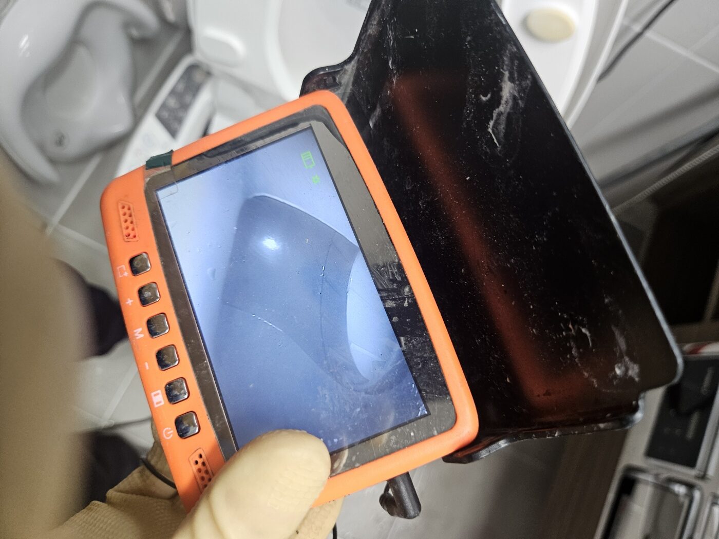 현장에서 주변 오염 여부와 설비 상태를 먼저 확인했습니다. 외관상 파손이나 누수 흔적은 없었지만, 실제로 테스트를 진행하자 초반 반응부터 둔했고 일정 수위 이상에서는 내려가지 않고 그대로 유지되는 현상이 확인되었습니다. 또한 내부에서 공기가 막히는 듯한 소리와 함께 흐름이 끊기는 반응이 반복되어, 내부 구간에서 통로가 크게 좁아진 상태로 판단했습니다. 이런 반응은 단순한 일시 현상이 아니라 내부에 덩어리가 자리 잡았을 가능성이 높아 탐지 과정을 진행했습니다.