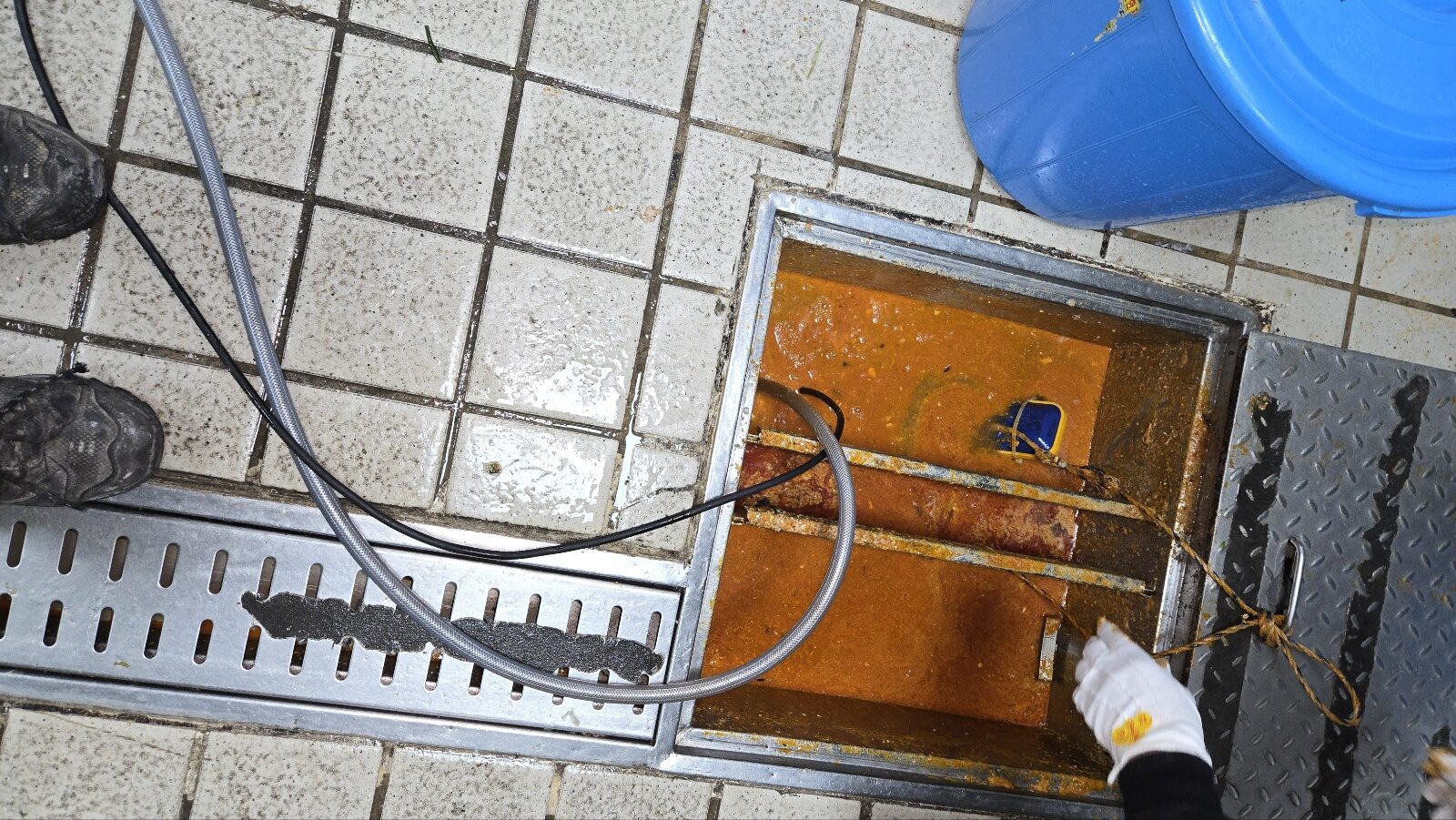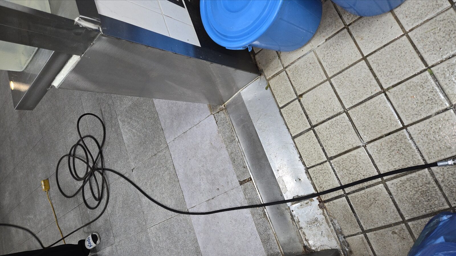 현장에 도착한 뒤 먼저 사장님께 증상이 시작된 시점과 현재 운영 상황을 자세히 들었습니다. 처음에는 물이 조금씩 늦게 내려가는 느낌이 있었는데, 어느 순간부터는 물이 고이면서 냄새까지 올라와 주방 전체가 불편해졌다고 하셨습니다. 영업 중간에 문제가 심해져 임시로 물 사용을 줄이면서 운영을 이어가고 계셨고, 빠른 조치가 필요한 상황이었습니다.
