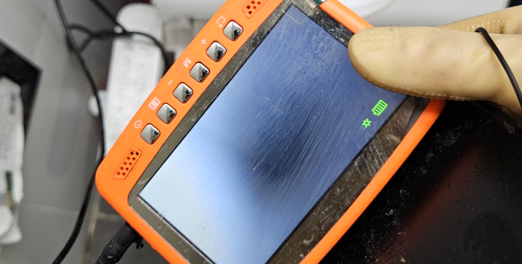 가장 먼저 진행한 것은 내부 상태를 정확히 확인하기 위한 탐지 작업이었습니다. 장비를 통해 확인한 결과, 배출 통로 초입을 지나 곡선 구간 근처에 단단한 이물이 자리 잡고 있는 것이 확인됐습니다. 단순히 흘러가는 성질의 물질이 아니라, 형태를 유지한 채 통로를 막고 있어 자연 배출이 어려운 구조였습니다.